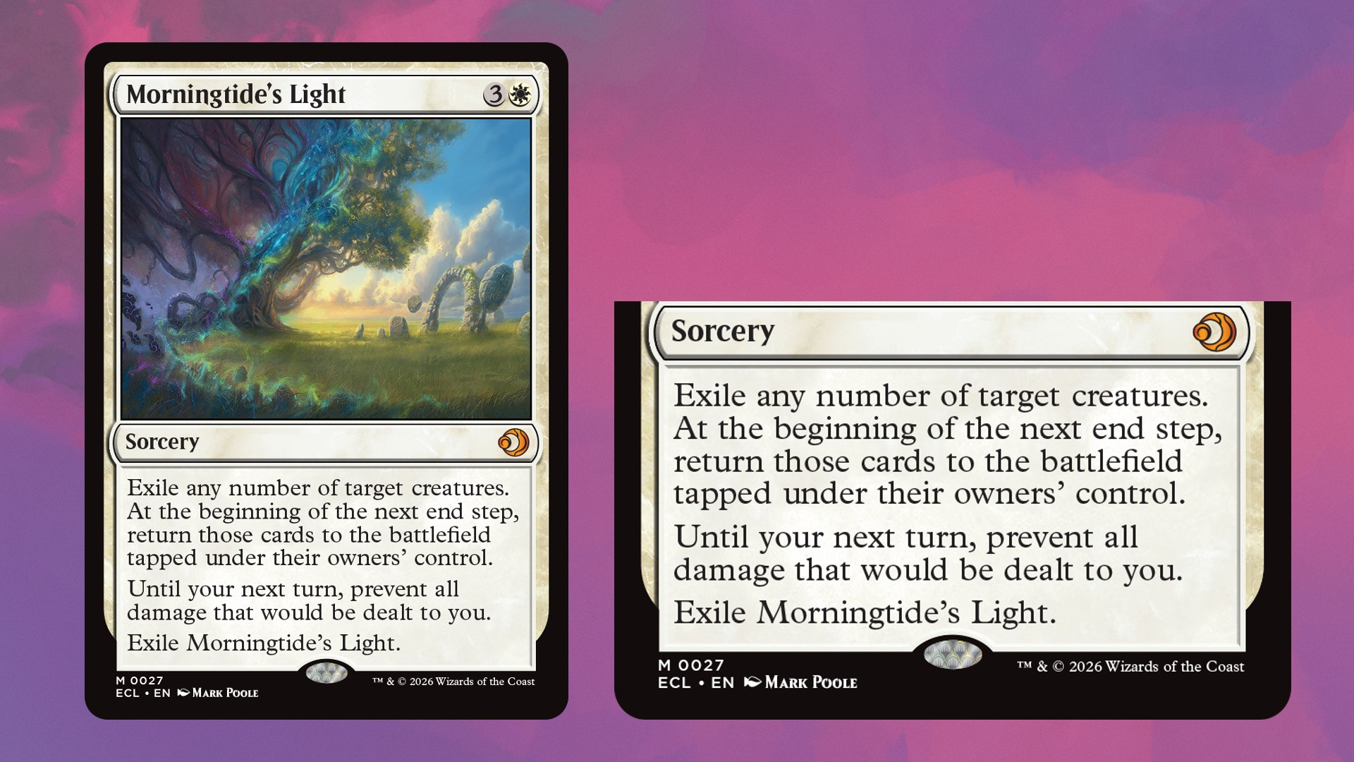 However, Lorwyn Eclipsed changes the general passing of light/dark aura, with creatures now being allowed to go between the worlds, with light/dark and day/night pushing up against each other. Storywise, some students from Strixhaven visit the 'twilighted' plane to see just what this new travelling between light and dark is all about.